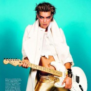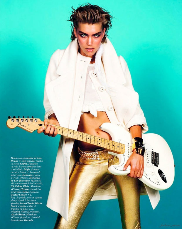Arizona Muse stars in an editorial for Vogue Paris’ December/January 2012 issue. The editorial titled “More Than A Woman” was styled by Emanuelle Alt, and shot by Inez Van Lamsweerde & Vinoodh Matadin. Arizona is featured in mostly gold and white attire acting out her best rocker poses. She is seen with a guitar in most of the shots, along with a gold “champion” style belt. Arizona also reveals her new shot hair in the editorial. It is a change Arizona recently comitted to and has never looked better. The Rocker style shoot was expected as Kate Moss is on the cover of the issue channeling David Bowie.