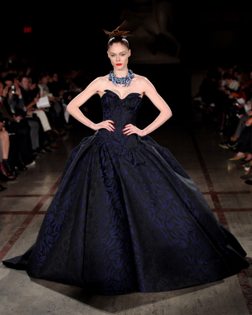 Last night was a big a big night for Coco Rocha. The canadian top model closed the Zac Posen New York show, walking fierce down the runway. Coco was the icing on the cake. She put her “wow factor” out of a glorious black and midnight-blue gown, composed of a structured corset and a full skirt. Just like a night exquisite bird, the model sported a feather-inspired hair style. Perfect, the red lips enhanced her porcelain complexion. A blue flowery necklace was a detail of absolute beauty.
