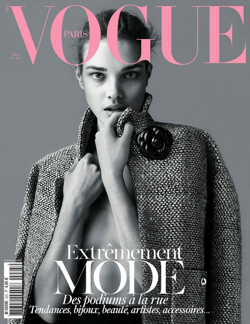 The cover of Vogue Paris March edition features the Russian supermodel Natalia Vodianova. Simply pouring all of her sweetness to Mert & Marcus’ lens, Natialia converted herself into a beautiful and delicate picture. In black and white, the majestic model announces a little more of the most wanted items for spring. Alluring, Natalia barely wears make-up, shows a relaxed hair do and sports a beautifully textured jacket over her naked torso. The black camelia is the final touch of a glamorous softness.