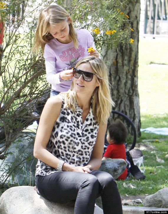 The day after the party, Miss Klum took the birthday girl and her three siblings (Lou, Samuel and Henry) to a lazy day at the park. The calm look in her face suggested meeting her ex-husband the day before might have been a tension-free event. Effortlessly chic in shades of black, white and grey, the Project Runway hostess was wearing a leopard print sleeveless blouse over black skinny jeans. Black sunglasses and a sparkling silver bracelet completed the outfit that Leni would be embelishing later, adorning her mother’s hair with yellow flowers.