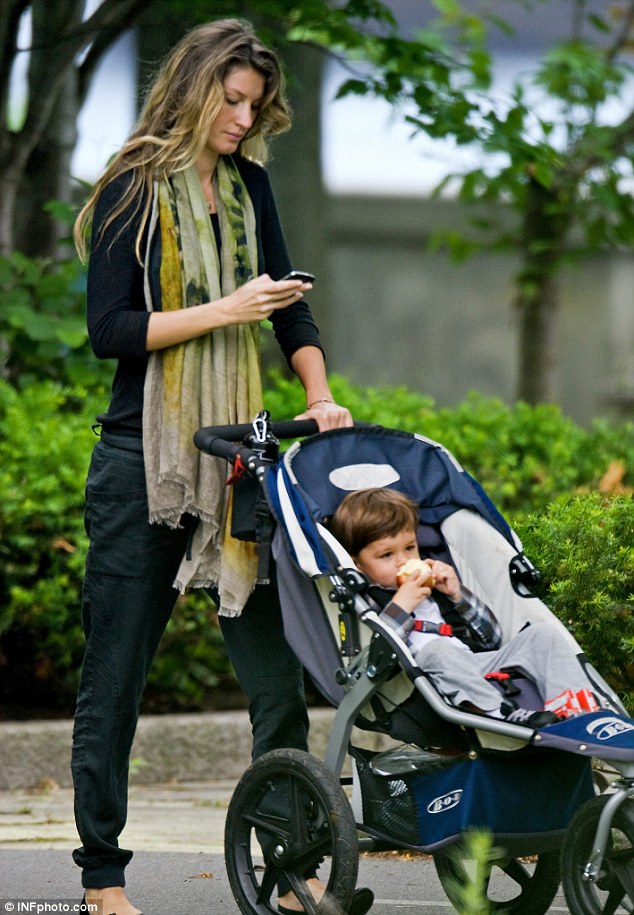 In the meantime, little Benjamin was showing some similarities to his father Tom Brady, star quarterback for the New England Patriots, as he ran around a playground, forcing his mother to work out a little to keep up with him. When he was done playing, adorable Benjamin got back to his jogging stroller and enjoyed eating a healthy apple. Juggling her stellar career with motherhood, Gisele managed to type on her phone and simultaneously push her son.