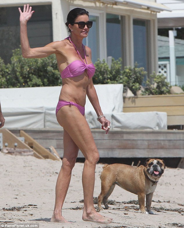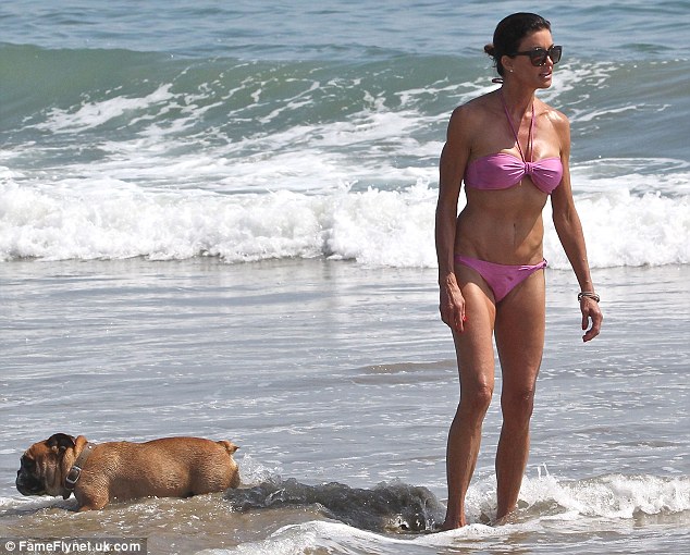 Dressed in a skimpy pink halter-top bikini she walked on the beach and played in the water with her dog Lloyd. The dog-walk soon turned into a photo-op as she preened and posed for photographers showing off her still enviable figure. The mother of two had her hair pulled back into a neat chignon and donned supermodel designer shades to keep the glare out of her eyes.