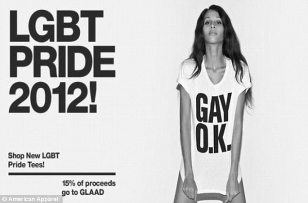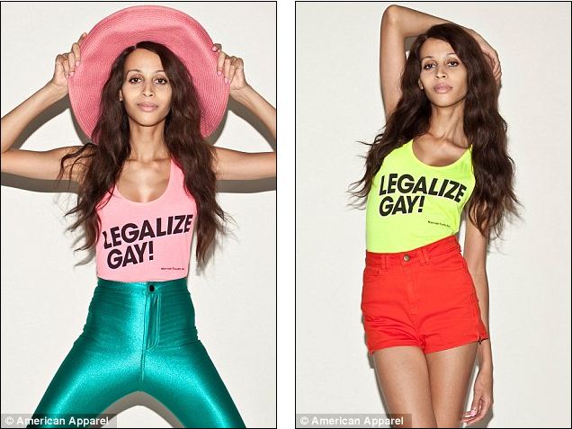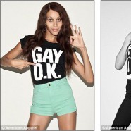 As a show of support for the gay community, the model who says she started life “in the wrong body” is seen posing in a series of screen printed tees with pro-gay slogans such as “Legalize Gay” and “Gay O.K. The t-shirts and tanks were made in partnership with the Gay and Lesbian Alliance Against Defamation (GLAAD). 15 per cent of the proceeds from sales will be donated to the organization to help fight homosexual prejudice.