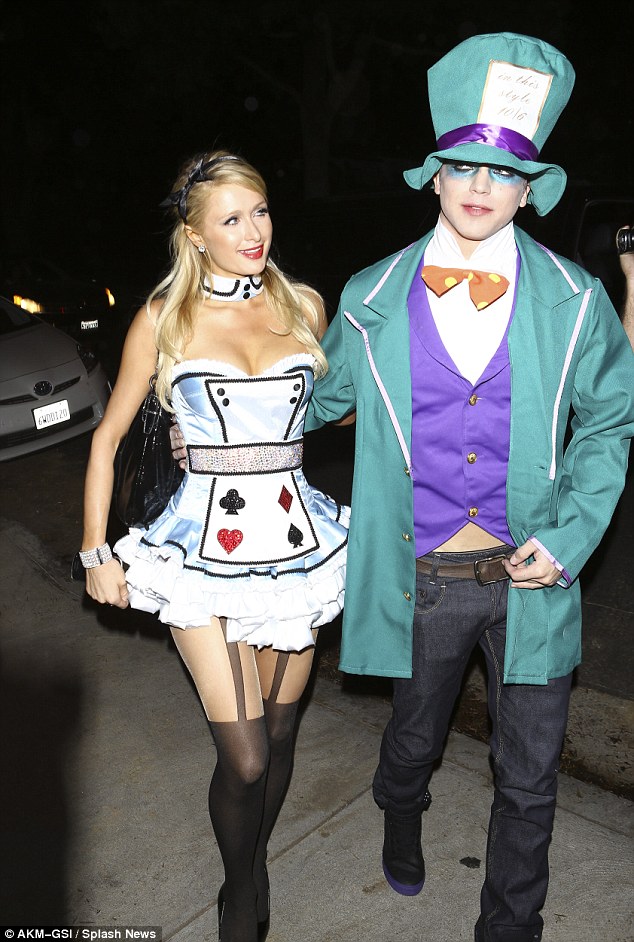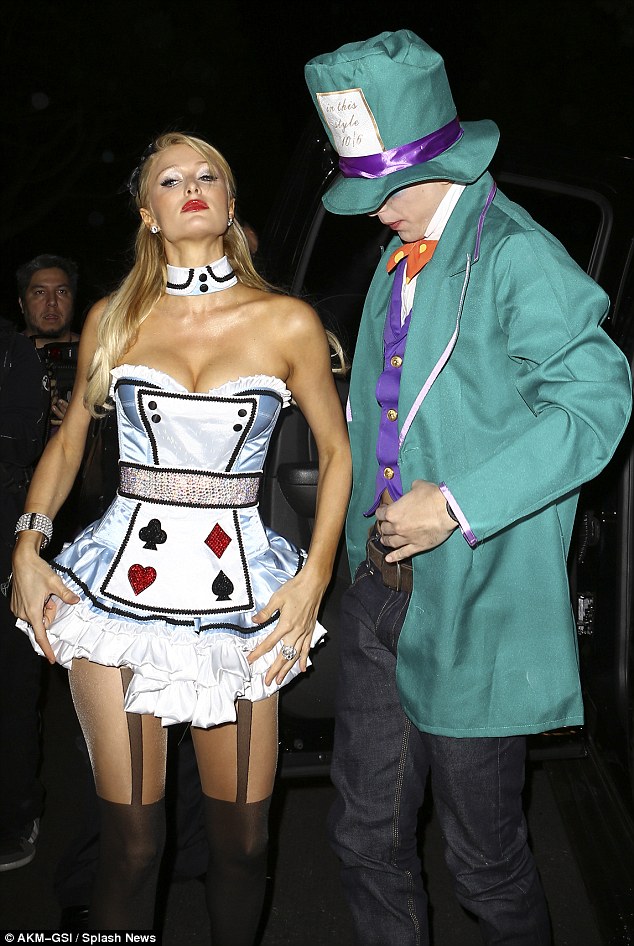 The socialite who loves changing her careers as much as she loves changing her boyfriends attended a big Halloween party in Beverly Hills with current beau, Spanish model River Viiperi in tow and he was dressed as….you guessed it, the Mad Hatter. The awesome twosome were all smiles as they smiled for the cameras and looked all loved-up as they made their way to the party. The lady loves dressing up folks and some of her more memorable Halloween costumes have been as a sexy sailor in a barely there white dress, a flight attendant in a sexy two-piece blue outfit complete with fishnet stockings and as a sexy soldier in a short camouflaged dress with garters holding her black stockings up. Yes, she was SEXY and she did the army proud. Coming back to the Alice in Wonderland look that she loves, we must say it suits her just fine. She is after-all an Alice in Wonderland herself in more ways than one. Will the real Alice in Wonderland, please stand up! Oops, she’s gone hiding and we can understand why. Enough said…