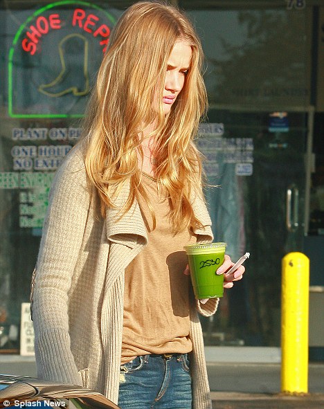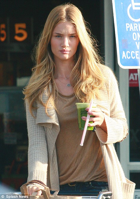 The model with the “angel’s look” was seen over the weekend holding onto a health drink concoction that hardly looked appetizing from the look of things. The juice looked green and thick but evidently it does wonders for the Victoria’s Secret model. Rosie was dressed down in blue jeans, a beige top and matching cardigan as she left Whole Foods in Hollywood holding the neon-colored drink. The look on her face seemed to say, “Oops, the secret’s out! I love what Incredible Hulk loves! It’s “green” and it’s good for you,” as she crinkled her pert little nose.