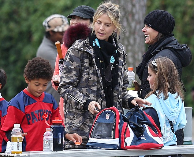 She’s a hands-on mum and she loves being the mainstay of her children’s lives. So it came as no surprise when she donned a camouflage jacket, ripped jeans and high-tops sans make-up to cheer her son Henri from the sidelines during a football match in Brentwood, California on Saturday. She was seen chatting with the other mothers as rain pelted down and even stopped to give Henri a little sideline pep talk which seemed to bolster his confidence.