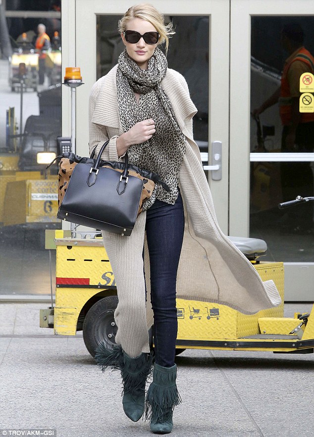 The model arrived in LA on Tuesday after spending time at the London Fashion Week looking runway ready. She wore a pair of skin-tight jeans, a long cardigan, her trademark fringe boots and pulled the look together with a leopard-print scarf which gave understated dressing the animal factor. Oh, the black and tan colored bag with the heart motif added to the mis-matched look but she made it all work. Leave it to a supermodel to show us how to do it right when it comes to throwing things together and looking like a million dollars.