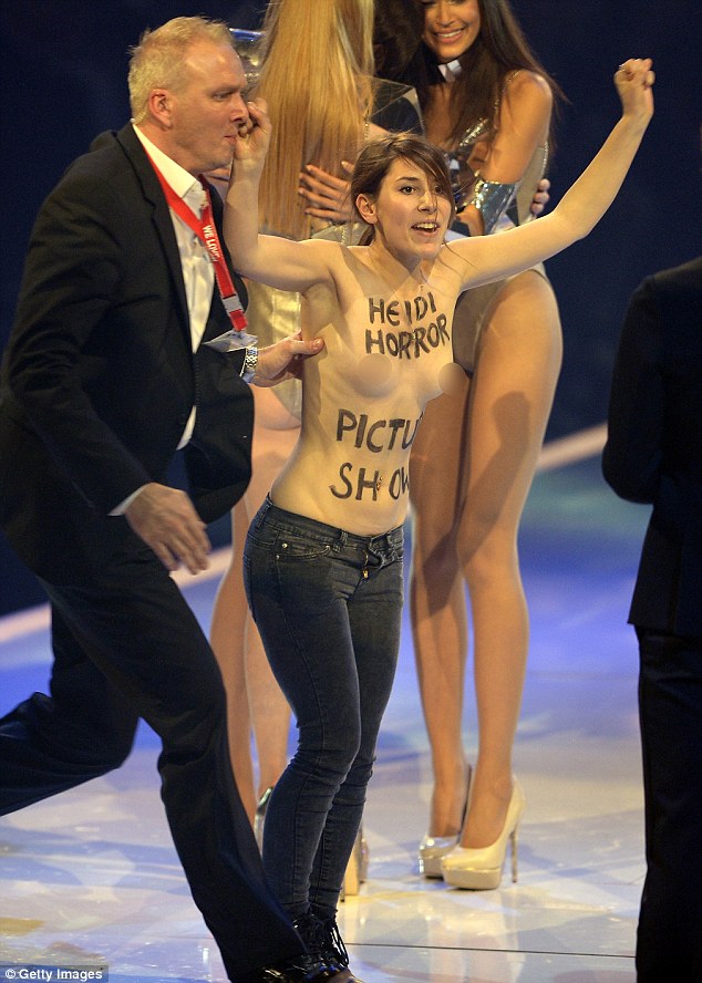 German-born Heidi was all smiles as she watched over her finalists like a protective mother hen and clucked over them as they took to the stage. All was well and going as planned when suddenly two topless female protesters stormed the stage and presented their messages boldly scrawled on their naked chests. One said, “Heidi Horror Picture Show” and the other, “Sadistic Show.” Obviously the protesters themselves didn’t know what they wanted to say! Security men dashed on to the stage but it was minutes before they carried the women off stage, obviously they had a hard time figuring out where to place their hands. Heidi, always the “professional” stood her ground and feigned ignorance. The show continued with no further interruptions and 16-year-old Lovelyn Enebechi garnered the coveted title with Maike van Grieken as runner-up. It was tears, surprise and applause as the contestants took to the stage as Heidi mimicked the emotions effortlessly. Another season took a final spin and closed with pomp and circumstance. Is it just us or did Heidi look much smaller than the finalists? Until next time, have a great day.
