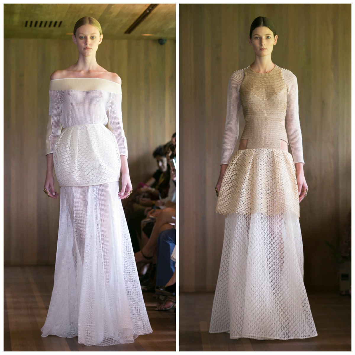 The collection of twenty-three garments transitioned from whites to creams to burnt oranges and primarily consisted of dresses of varied lengths. While Raia played with textures, patterns, and cut-out fabrics on the bodices and sleeves, she kept the skirts fairly simple. Those were constructed of sheer materials, petaled overlays, or a combination of the two; she also tiered several of the skirts.