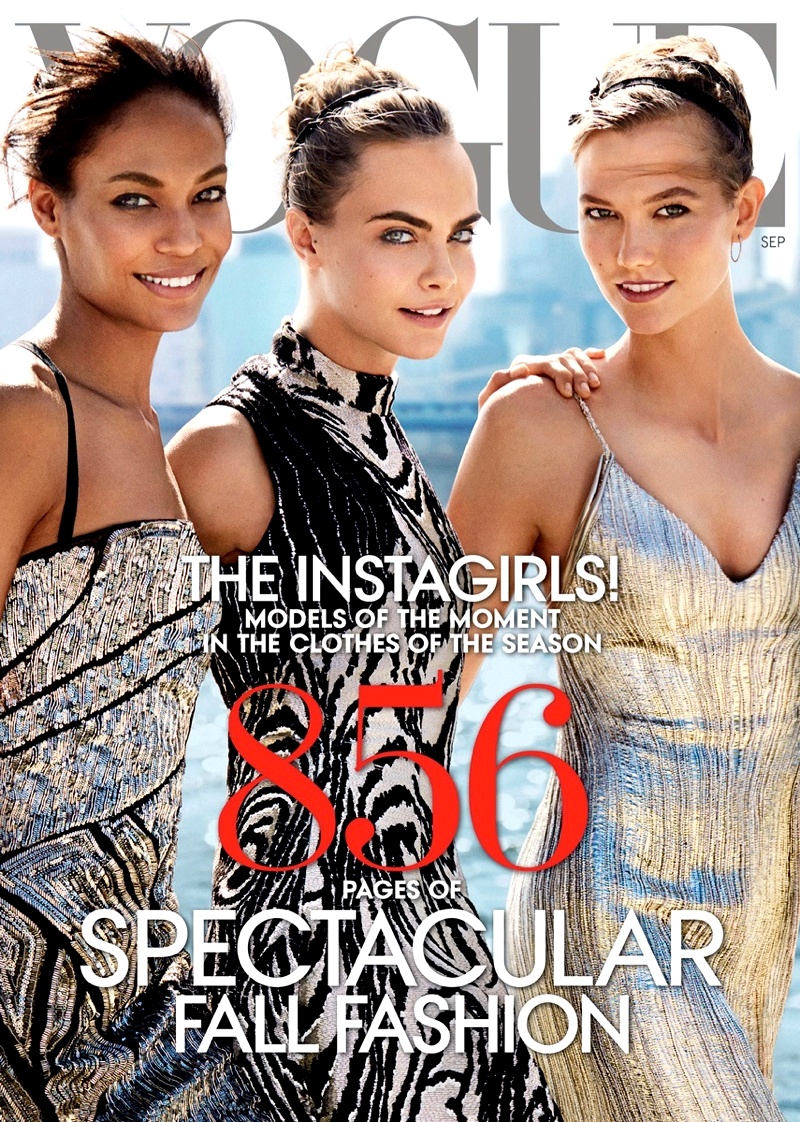 Famed photographer Mario Testino shot the models who are seen standing arm in arm with smiles and have been dubbed as “The Instagirls” due to their social media presence. In recent years, September Issue covers have almost exclusively featured celebs like Jennifer Lawrence (2013), Lady Gaga (2012), Halle Berry (2010), and Charlize Theron (2009) but this year’s cover somewhat surprisingly puts models front and center making it quite a departure for Vogue.