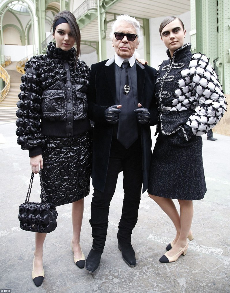 Both beauties walked the runway sporting an ensemble of outfits ranging from the autumn/winter collection. Cara modeled an outfit inspired the classic Chanel jacket as well as a sleeveless babydoll dress. Kendall modeled a babydoll dress as well and a black bubble coat.