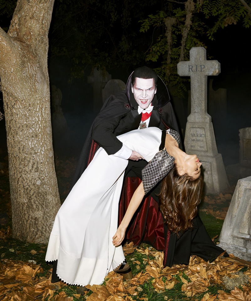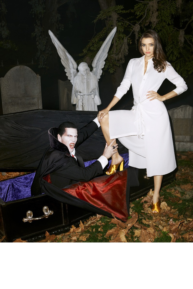 In one image, she wears a white Carolina Herrera wrap dress and chunky mustard Marc Jacobs heeled mule sandals asserting her dominance over a hot male vampire rising from a coffin. In another photo, dressed in a white, flowing Louis Vuitton gown with black trimming on the bodice and embellished sleeves she is seen held in the arms of a vampire.