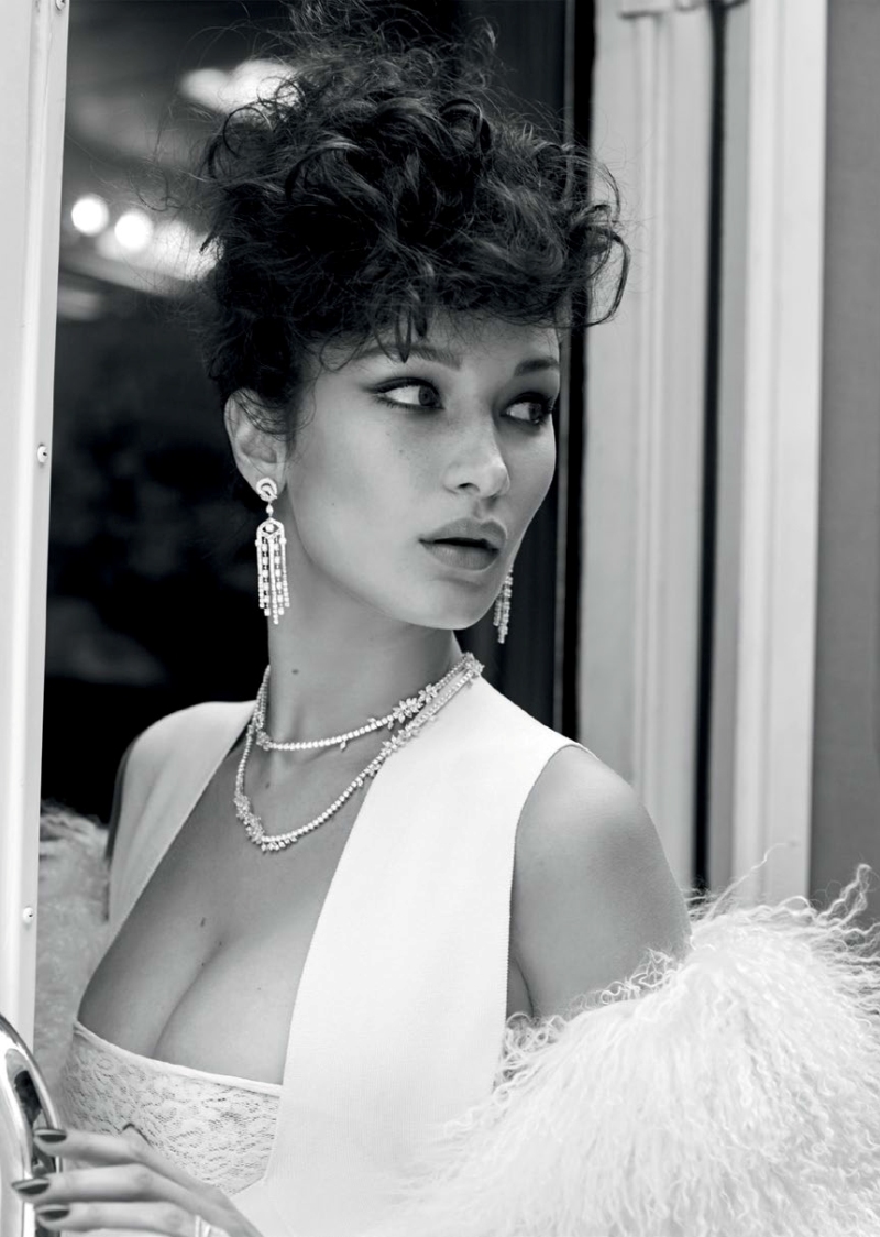 The accompanying shoot by Sebastian Faena is a 80s glamorous Hollywood inspired one that has Bella sporting a white ensemble by Givenchy, an updo Pompadour look while the California native leans against a door, and looks directly at the camera.