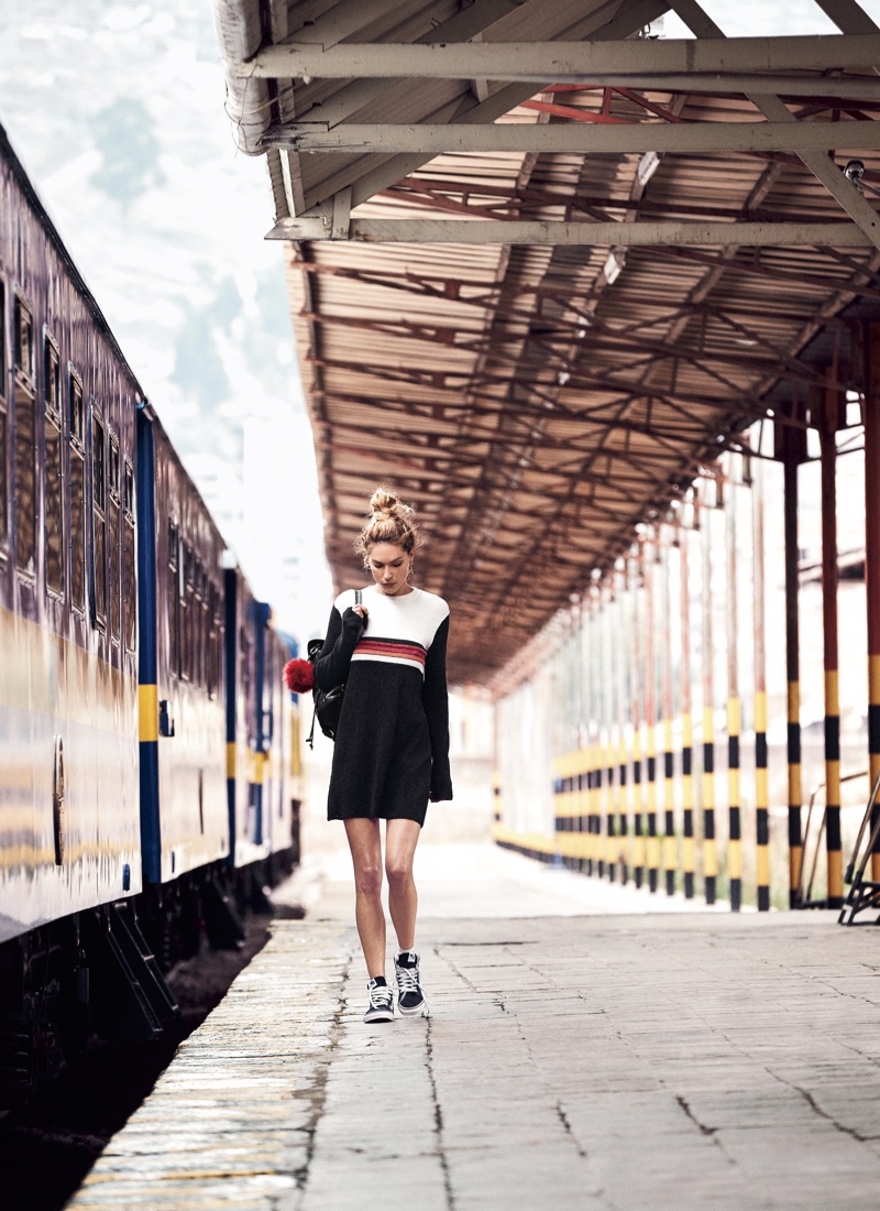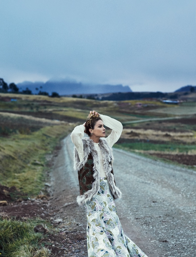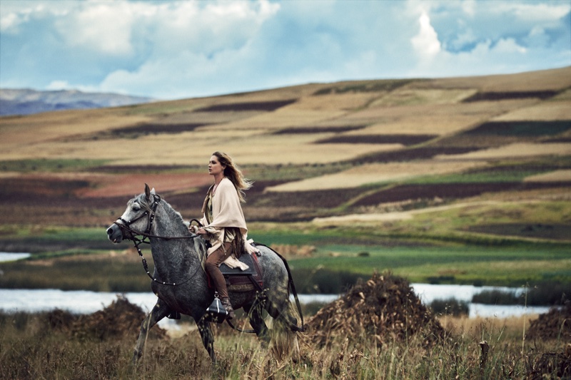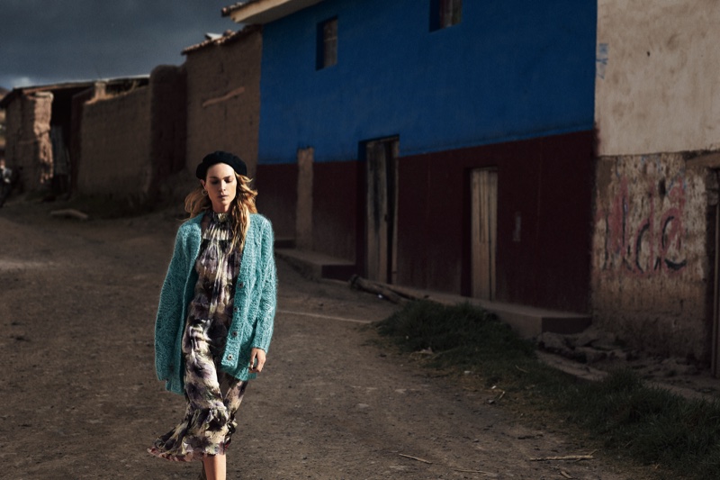 Photographed on location in the beautiful streets of Peru by Bjorn Iooss, the campaign images shows Wasson acting almost like a tourist in the wild and deserted landscapes of the South American. The 34-year-old model sports bohemian inspired ensembles of blouses with V-neck, floral maxi dresses, and military inspired jackets.