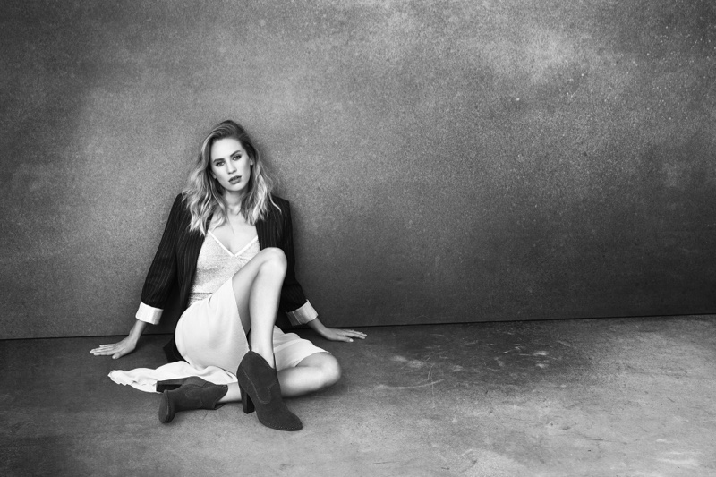 The Actress, model and daughter of Sean Penn and Robin Wright appears in a series of minimalist black and white campaign images that were lensed by Bjorn Iooss. Wearing a white dress paired with brown leather boots she is seen sitting on the floor, leaning against a wall.