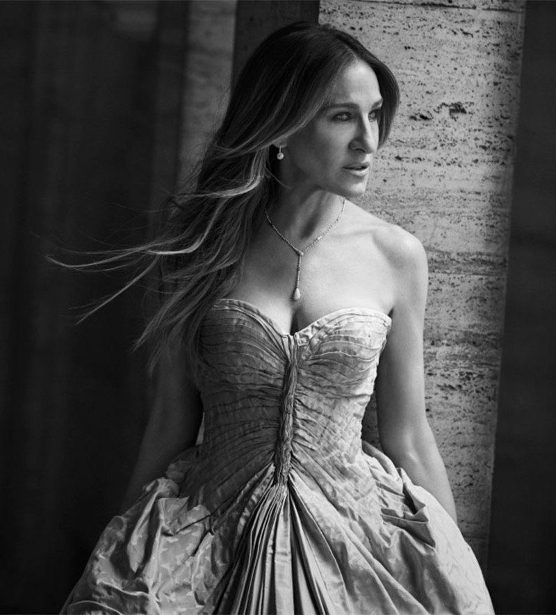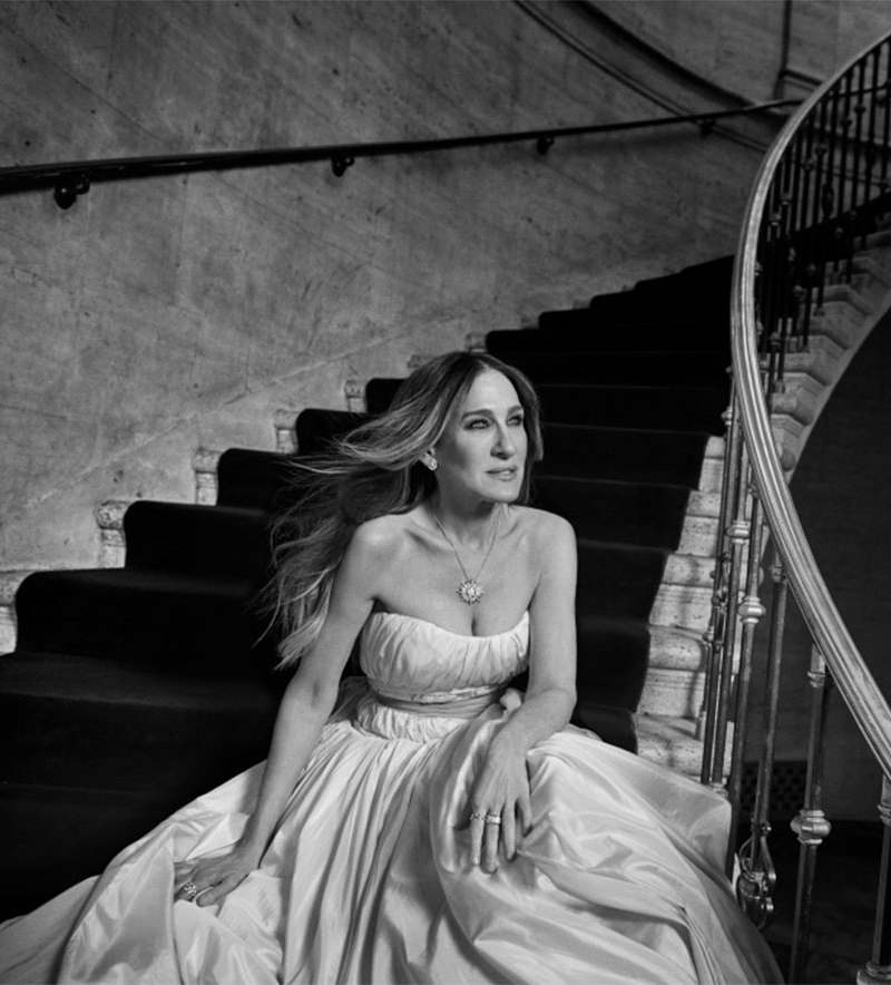 In a series of beautiful black and white pictures, the ‘Sex and the City’ actress poses in glamorous evening dresses in front of the historic Academy Mansion in New York City, modeling earrings and necklaces from the brands collection.