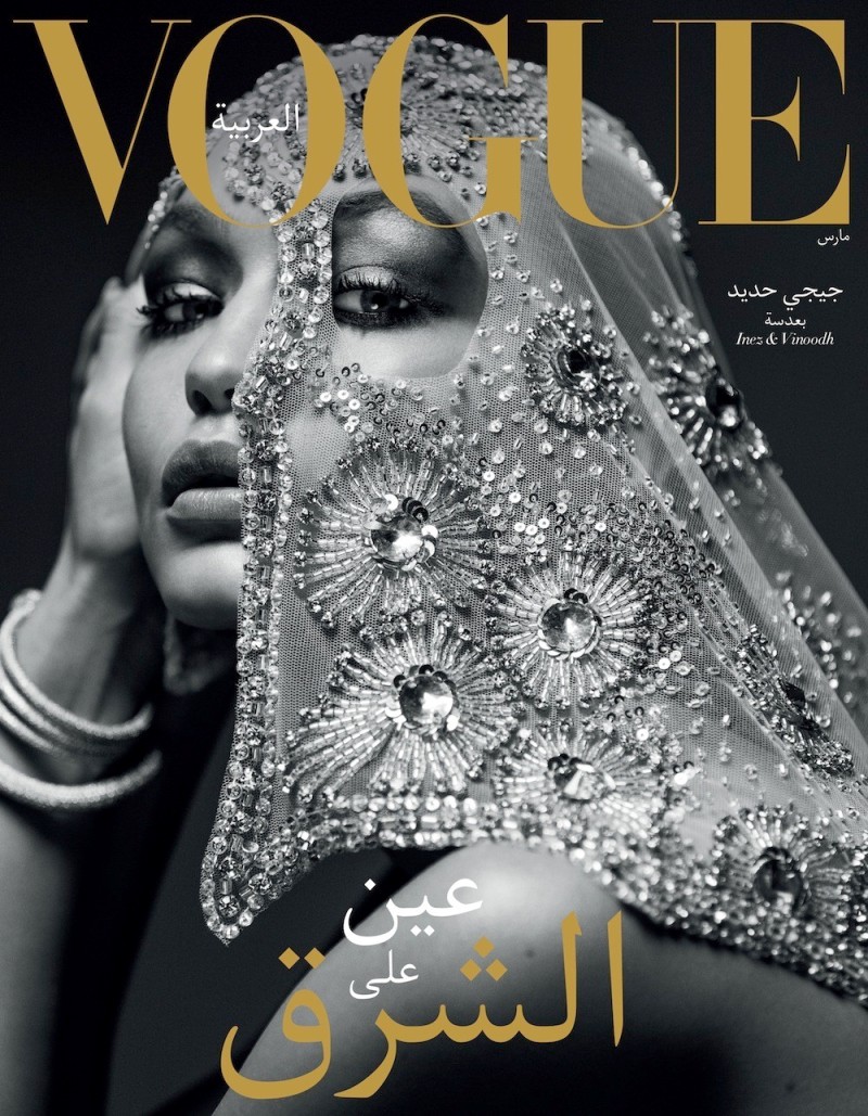 The magazine chose the ‘model of the moment’ for its inaugural print edition which is also the 22nd international title of Vogue. Hadid, who has Palestinian roots via her father, appears on the cover half-turned toward the camera, her face partially covered with a richly embroidered veil. The black-and-white photo was lensed by photography duo Inez van Lamsweerde and Vinoodh Matadin.