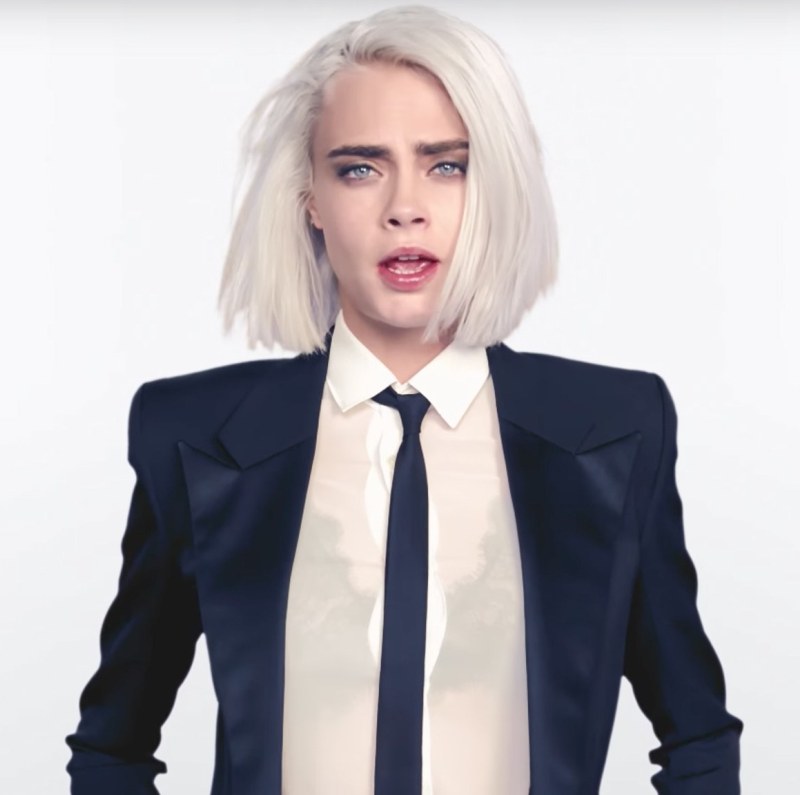 In the video which was shot by “Valerian” director Luc Besson, Delevingne enchants with a tailored navy suit and 3 different hairstyles: blonde, brunette, and redhead.