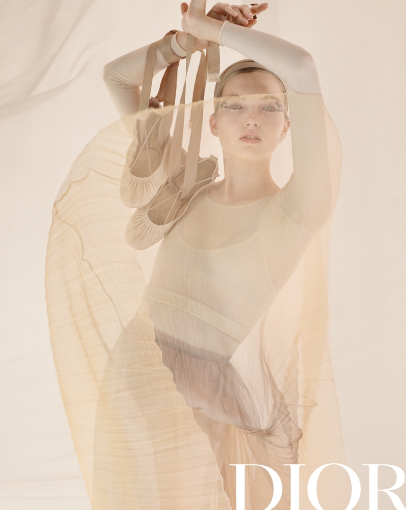 The campaign pays tribute to the new pieces of the season designed by Maria Grazia Chiuri: in a multitude of nude shades, fine fabrics and soft textures between elegance, discretion, and softness. One can also discover flowy dresses, skirts, and sheer garments, directly inspired by the world of the dance. There is also the re-issue of the iconic Dior saddle bag as well as gold-hued lame dresses.
