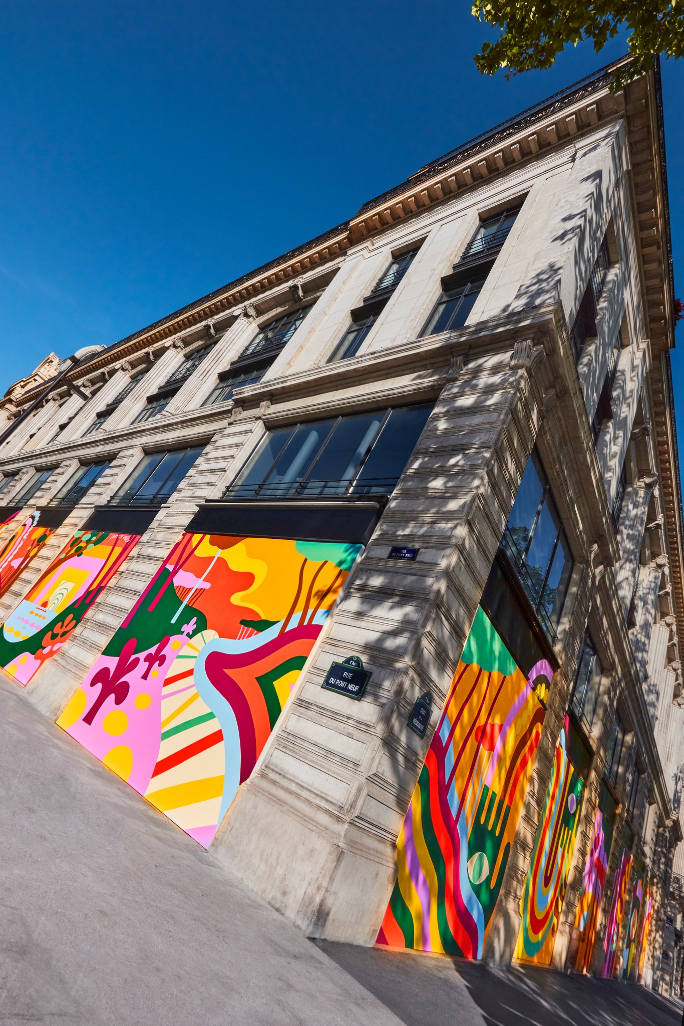 The fresco consists of 14 colorful and playful paintings that stretches more than 900 feet, across 14 window facades. Together they spread a positive message and positive vibes to the Pont Neuf neighborhood during the current lockdown.