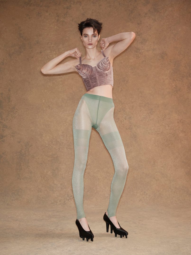 Known as the in-house stylist for Balenciaga, Vetements, and the creative behind the viral Miu Miu miniskirt styling, Volkova received access to the fashion house’s extensive archives to reimagine signature and couture pieces for a modern audience. Emblematic Jean Paul Gaultier pieces, ready-to-wear and couture silhouettes have been reinterpreted with her signature subculture-blending aesthetic. The iconic 1984 velvet cone midi dress has been abbreviated into a mini dress and top, while the tennis striped suit is deconstructed with harness inserts, reminiscent of SM and fetishism.