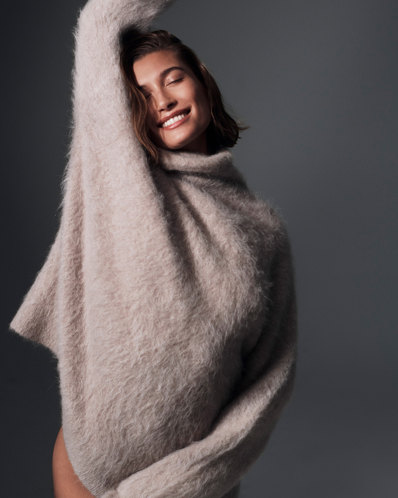 Lensed by James Brodribb, the two stars bring the festive cheer in a series of expressive portraits that are rooted in the celebratory nature of the giving season. Highlighting different holiday styling concepts, Hailey appears in cozy knit looks while Flynn rocks signature denim and underwear.
