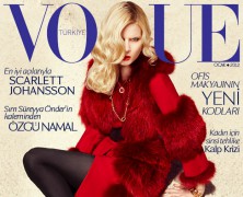 KT Auleta photographed the Swedish model Elsa Sylvan for the cover of Vogue Turkey January edition. This blond beauty seems to be alluringly poising against a stone wall, with half face hidden and firing a shooting glance. Wearing a fierce red fur coat over black tights and golden-heel...